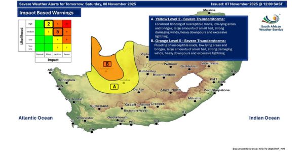 Oranje vlak 5-waarskuwing vir donderstorms vir môre uitgereik