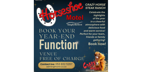 Hou jou jaareindfunksie by die Horseshoe Motel. Skakel die Horseshoe Motel Kimberley by 053 832 5267 om jou bespreking te maak of stuur ‘n e-pos