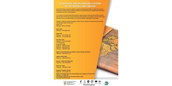 Suid-Afrikaners wat tans in die Midde-Ooste is, word aangeraai om in geval van nood direk hul plaaslike ambassade of konsulaat te kontak. Volgens die departement