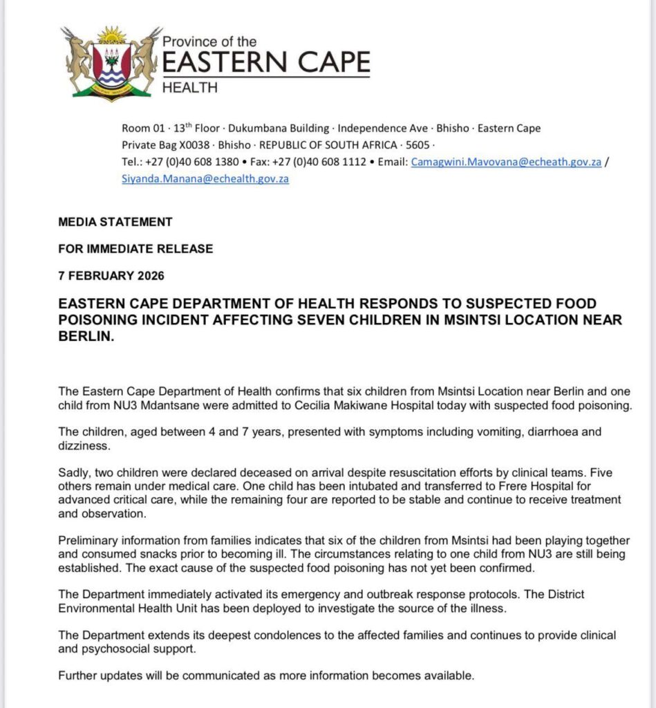 Die departement van gesondheid in die provinsie sê die twee kinders is met hul aankoms by Cecilia Makiwane-hospitaal dood verklaar. Vyf ander kinders word steeds behandel, van wie een in ’n kritieke toestand in die Frere-hospitaal is. Volgens voorlopige inligting het ses van die kinders saam versnaperinge geëet voordat hulle ongesteld geraak het.