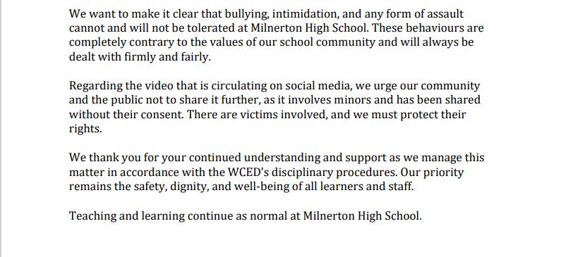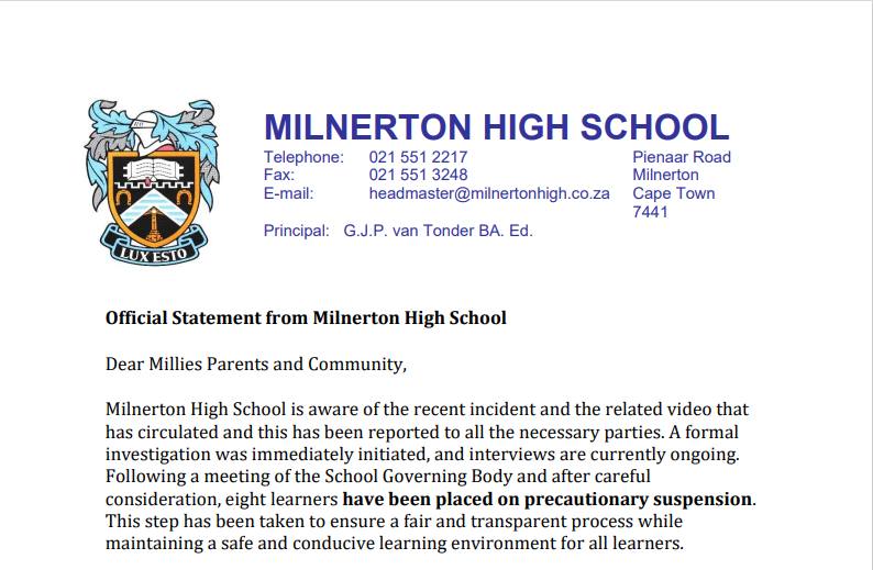 HoĆ«rskool Milnerton het Woensdag bevestig agt leelinge is as voorsorgmaatreĆ«l geskors. Die Wes-Kaap-onderwysdepartement het in ‘n verklaring gesĆŖ die skool het dadelik stappe vir ‘n ondersoek begin. Stappe word geneem sodat alle leerlinge wel hulle matriekeksamen kan skryf.