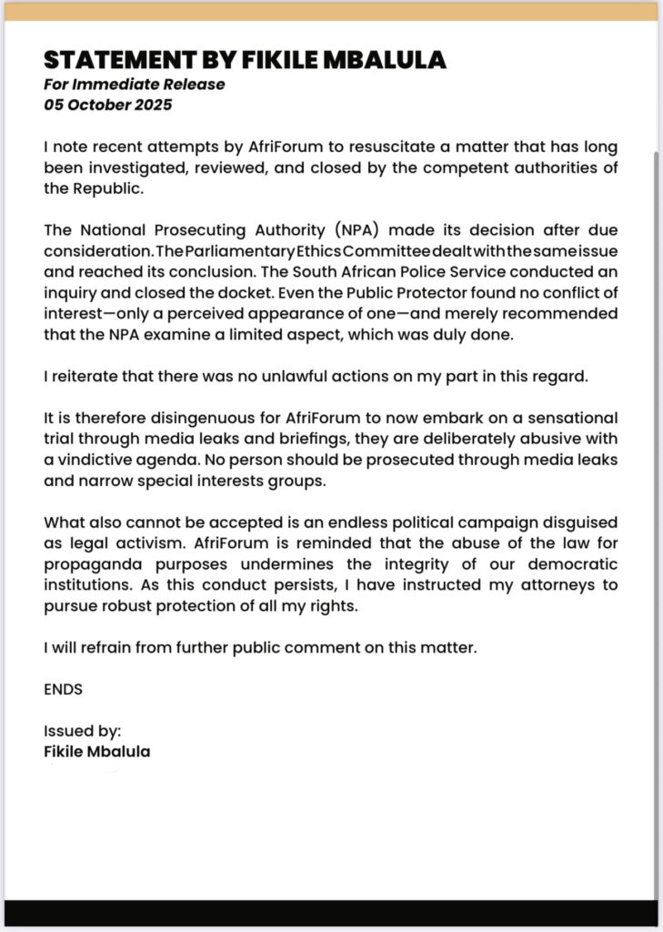 In ’n verklaring sê Mbalula hy neem kennis van die organisasie se jongste pogings om “’n aangeleentheid wat lankal deur bevoegde owerhede ondersoek en afgehandel is” weer op te rakel.