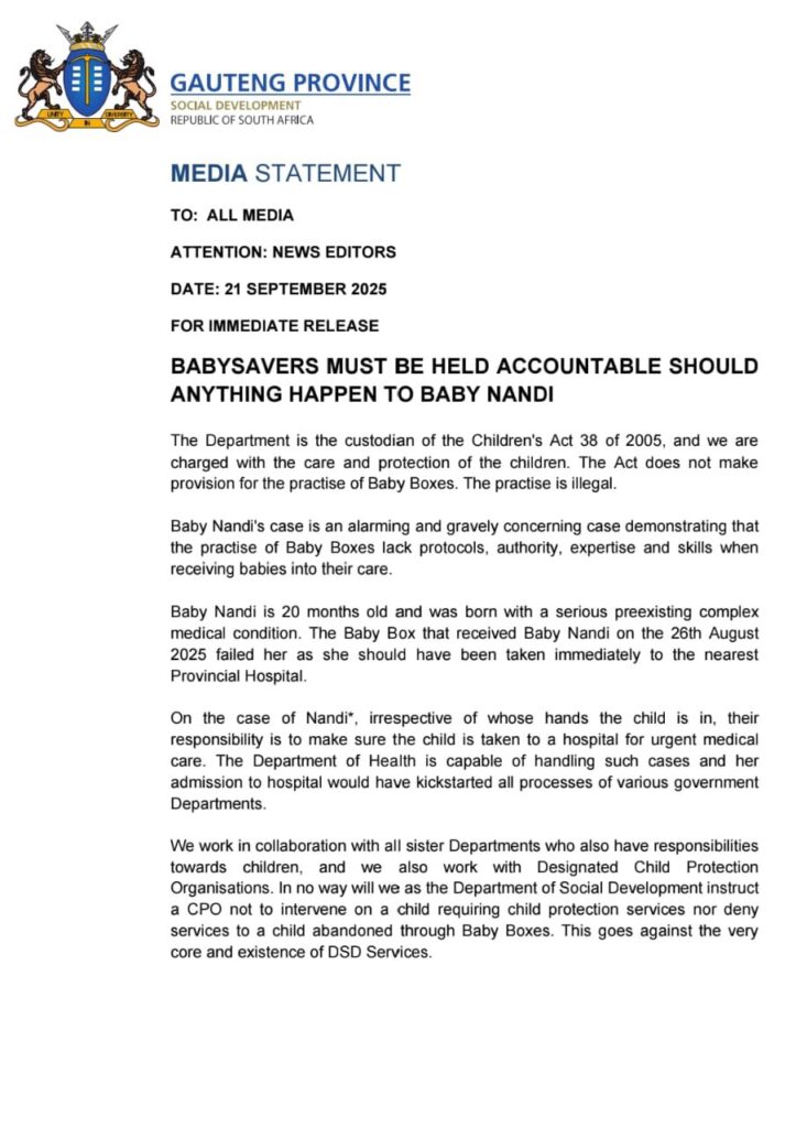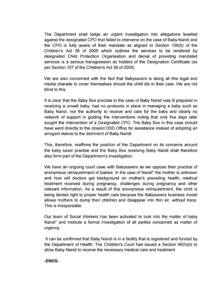 Baby Savers SA sê voorts in ‘n sosialemediaplasing die Kinderwet bepaal dat maatskaplike werkers verplig is om statutêre dienste te verskaf aan kinders wat sorg en beskerming benodig. “Geld dit vir alle kinders? Dit blyk nie so te wees nie. ’n Baba met ernstige spesiale behoeftes is onlangs in ’n bababoks geplaas en het nie slegs nie hierdie dienste ontvang nie, maar is ook van broodnodige mediese sorg weerhou. Hierdie klein meisie is op haar sterfbed. Wie sal aanspreeklik gehou word vir hierdie sinnelose gedrag? Aan wie se hande sal haar bloed wees? Wie sal verantwoordelikheid aanvaar vir die ontkenning van sorg en beskerming aan ’n kind wat dit benodig – presies dit? Dankie aan diegene wat wel omgee en ’n verskil maak.”