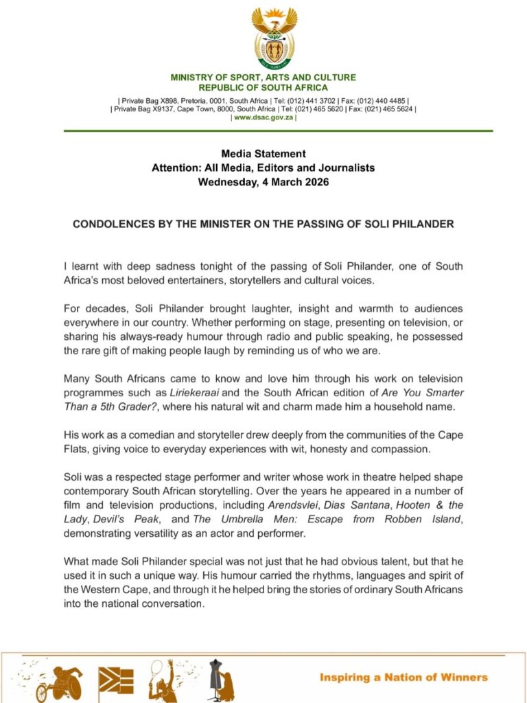Die minister sê Philander sal onthou word as een van die land se mees geliefde kunstenaars wat oor baie jare gehore laat lag en dink het. Hy was bekend vir sy werk op die verhoog, televisie, radio en as spreker waar sy unieke humor mense regoor Suid-Afrika bymekaar gebring het. Baie mense het Philander leer ken deur sy verskyning op programme soos Liriekeraai en die Suid-Afrikaanse weergawe van Are You Smarter Than a 5th Grader?, waar sy skerp sin vir humor en warm persoonlikheid hom ’n huishoudelike naam gemaak het. Sy komedie en storievertelling het dikwels inspirasie uit die gemeenskappe van die Kaapse Vlakte geput, waar hy alledaagse ervarings met humor, eerlikheid en deernis gedeel het. Philander was ook ’n gerespekteerde akteur en skrywer wat oor die jare in verskeie film- en televisieproduksies verskyn het, onder meer Arendsvlei, Dias Santana, Hooten & the Lady, Devil’s Peak en The Umbrella Men: Escape from Robben Island.
