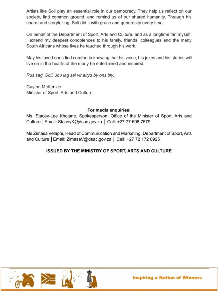 Gayton Mckenzie, die minister van sport, kuns en kultuur, het sy meegevoel met Philander se afsterwe uitgespreek en hulde gebring.