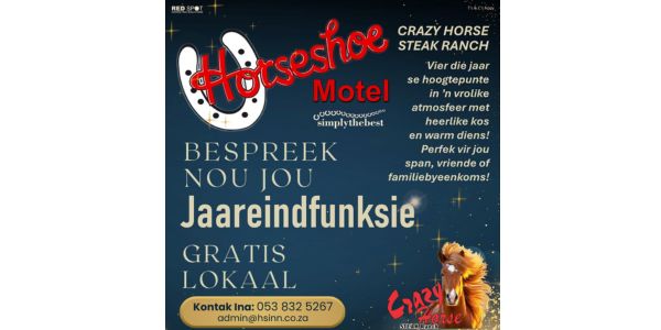 Hou jou jaareindfunksie by die Horseshoe Motel. Skakel die Horseshoe Motel Kimberley by 053 832 5267 om jou bespreking te maak of stuur ‘n e-pos aan admin@hsinn.co.za vir meer inligting.
