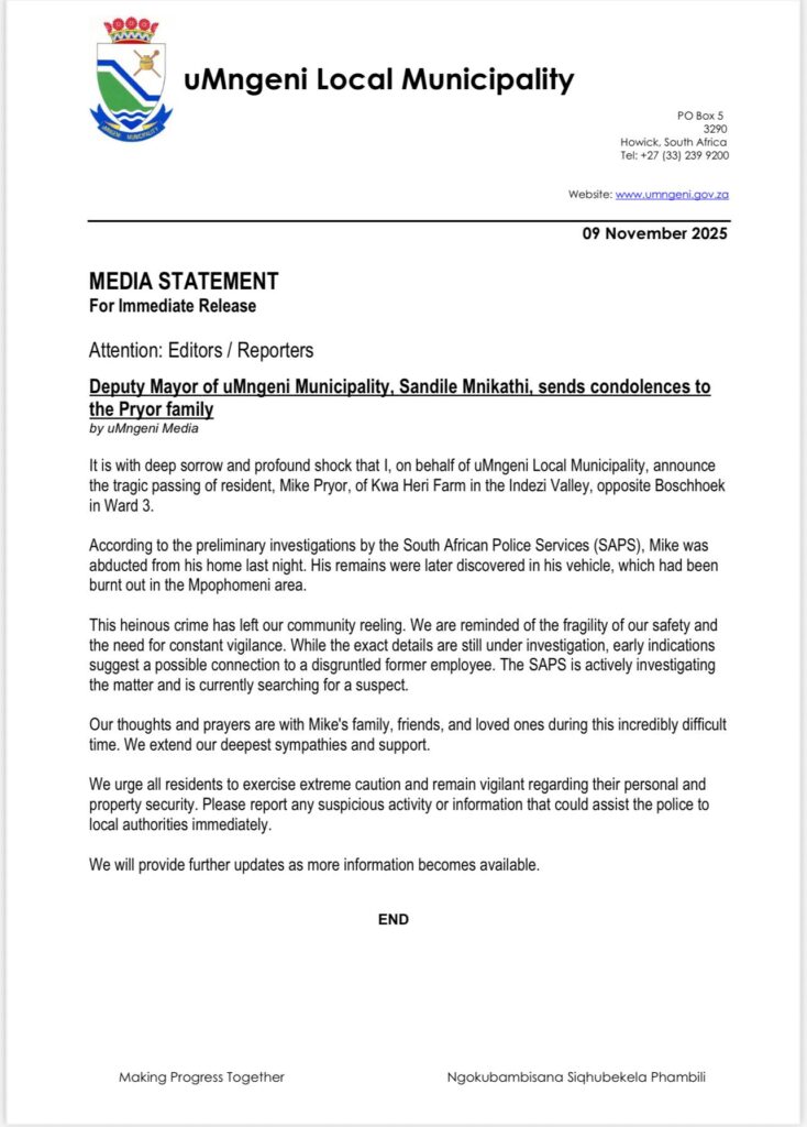 KWAZULU-NATAL. – Mike Pryor (56), ‘n boer van die plaas Kwa Heri in die Indezi Vallei, wat Saterdagaand uit sy huis ontvoer is, se liggaam is onherkenbaar verbrand in die bagasieruim van ‘n uitgebrande voertuig se kattebak op ‘n weidingplaas ontdek.
