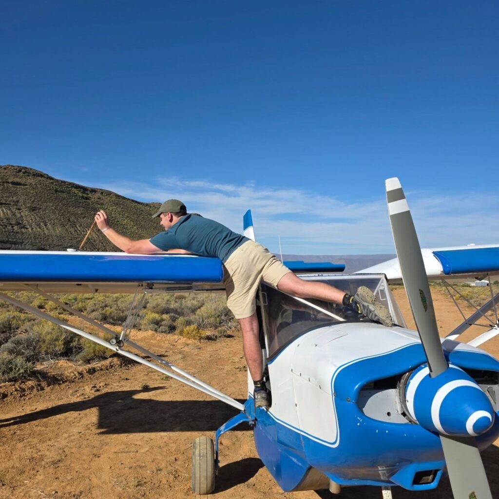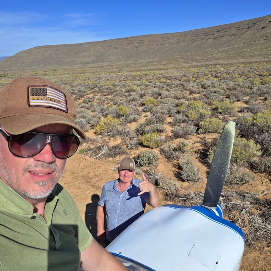 Die sanger het foto’s van hom en die landskap, ligte vliegtuig, vlieënier en die plek van die vermiste brandstofprop op die vliegtuig se vlerk gedeel.
