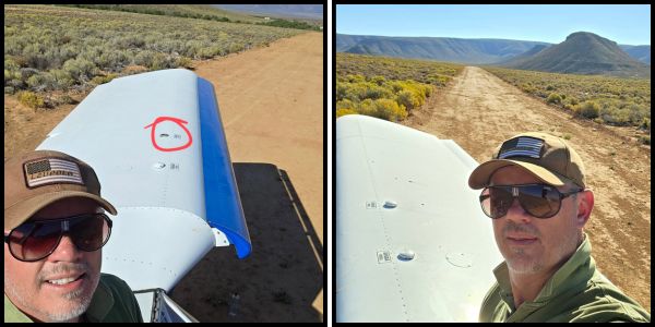 Die sanger het foto’s van hom en die landskap, ligte vliegtuig, vlieënier en die plek van die vermiste brandstofprop op die vliegtuig se vlerk gedeel.