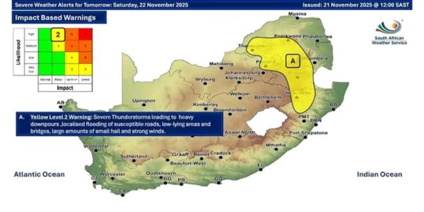 Geel vlak 2-waarskuwing vir donderstorms vir vandag uitgereik