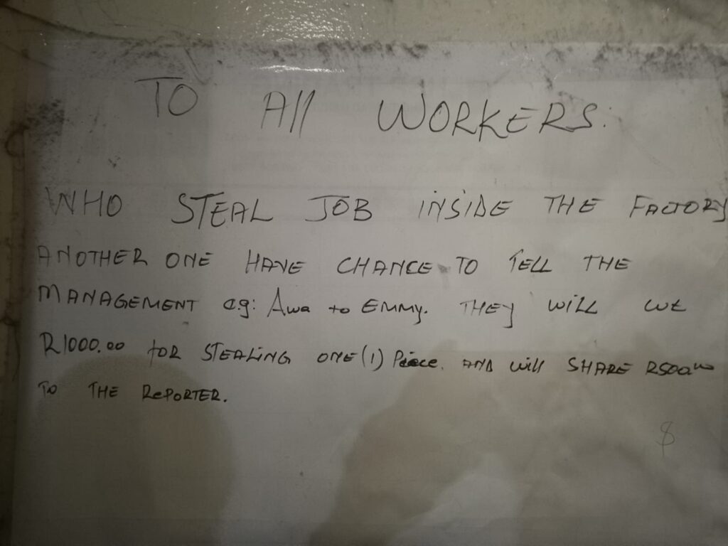Volgens die departement van indiensneming en arbeid het die ondersoekspan gedurende die inspeksie duisende onwettige werkers gevind wat op die persele van die kleding- en tekstielfabrieke woon. Hierdie fabrieke werk dikwels sonder om basiese arbeidswette en ander wette van die land na te kom, wat volgens die departement as ‘n gevaar beskou word. Die inspeksie is in samewerking met die polisie, Newcastle-metropolisie en die departement van binnelandse sake uitgevoer, met die portefeuljekomitee oor indiensneming en arbeid as toesighouer.
