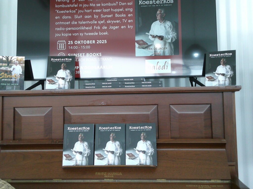 Sunset Books is ’n gewilde boek- en koffie winkel in Strand Straat en word deur eienaar Udine Joubert bestuur. Sowat 40 gaste, oud en jonk het die bekendstelling bygewoon. Daar het ‘n gemoedelike atmosfeer geheers. Die gehoor was interaktief, het saam gesels en vrae gevra. “… en dit raak my hart, dit is vir my ’n koestering,” het Frik gesê. Van die gaste het ernstig begin wonder wat van hulle eie ma’s en oumas se kookboeke geword het.