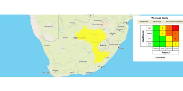 ‘n Geel vlak 2-waarskuwing vir donderstorms is vir dele van Noord-Wes, die Noord-Kaap, Vrystaat en Oos-Kaap uitgereik. Daar is ‘n moontlikheid van oorstromings, hael, skade aan infrastruktuur en onderbreking van noodsaaklike dienste.