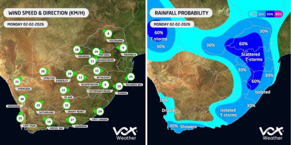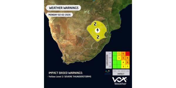 Volgens Annette Botha, Vox Weather-meteoroloog, sê die Suid-Afrikaanse weerdiens sommige oostelike streke kan deur donderstorms getref word, wat swaar neerslae, oormatige weerlig, hael en sterk winde kan meebring. Gauteng, die Hoëveld en platorand van Mpumalanga, die suidwestelike dele van Limpopo, asook die oostelike dele van Noordwes en die Vrystaat, is onder ’n Geel Vlak 2-impakwaarskuwing geplaas. Plaaslike oorstromings van paaie, laagliggende gebiede en brûe, sowel as skade aan infrastruktuur en nedersettings, kan voorkom.