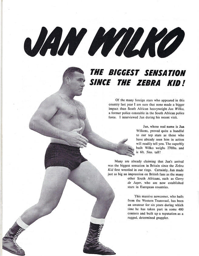 Jan Wilkens, die bekende 1.96 m lange Suid-Afrikaanse stoeier, is Sondag in die ouderdom van 83 oorlede. Hy het sy debuut in 1955 gemaak en in 1987 uitgetree.
