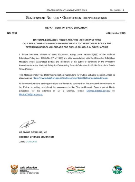 GAUTENG. – Siviwe Gwarube, die minister van basiese onderwys, het die publiek genooi om op voorgestelde wysigings aan die nasionale beleid vir die bepaling van skoolkalenders vir openbare skole in Suid-Afrika kommentaar te lewer .