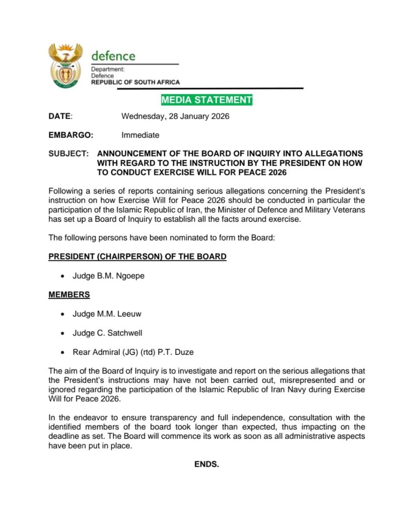Angie Motshekga, die minister van verdediging en militêre veterane, het ‘n kommissie van ondersoek saamgestel om beweringe oor die vlootoefening Will for Peace 2026 te ondersoek. Dit volg nadat president Cyril Ramaphosa ‘n spesifieke instruksie uitgereik het oor die deelname van die Islamiese Republiek van Iran en dit blyk of die instruksie verontagsaam is.