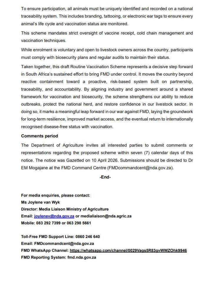 GAUTENG. – John Steenhuisen, die minister van landbou, het planne aangekondig om landwyd ’n konsep- roetine-inentingskema teen bek-en-klouseer in te stel. Belanghebbendes het sewe kalenderdae tyd, vanaf 10 April, om kommentaar oor die konsepvoorstel in te dien.
