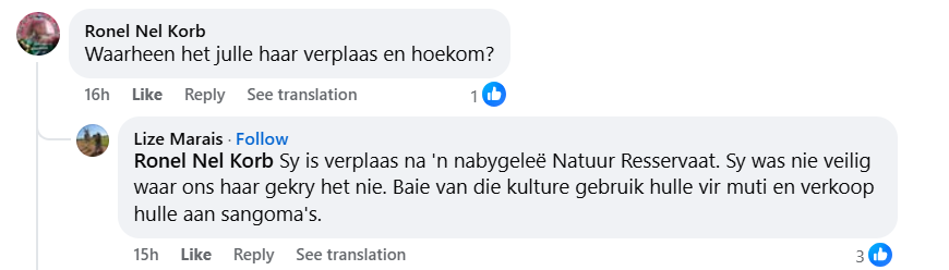 Volgens Lize Marais is dié slang al vir sowat vier jaar net deur spore, ’n waarneming deur ’n werker wat haar een keer in ’n dam sien swem het en ’n enkele kamera-opname bekend. Verder is sy nooit werklik gesien nie. Dié indrukwekkende slang het egter uiteindelik haar verskyning gemaak toe sy in die son gelê het saam met ’n kleiner mannetjie van sowat 2 meter.