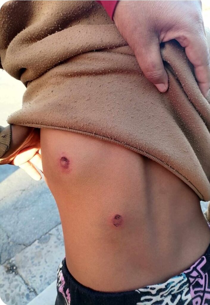 Leon Campher, wat ‘n foto van die kinders in die beweerde voorval se beserings gedeel het (hier onder), sê: “Aanranding op kinders: Die kinders is opgespoor en saak sal voortgaan. Al het die kinders verkeerd gedoen soos nou beweer word, het niemand reg om hulle aan te rand nie. Moet dit toegelaat word dat die oortreders sommer gister gou klaer, aanklaer en judge speel en reeds die kinders sonder n verhoor kon straf? Die is aanranding ernstig. Finish en klaar.”