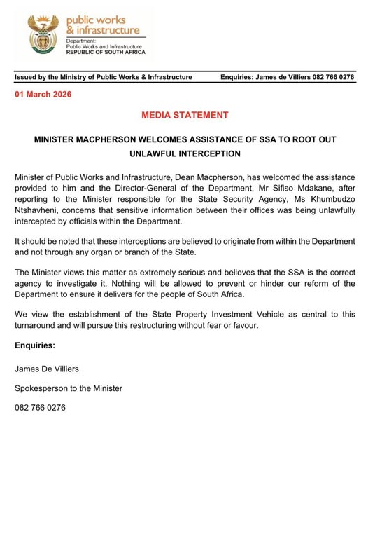 Macpherson, die parlementslid vir die DA, minister van openbare werke en infrastruktuur, asook die DA se provinsiale voorsitter in KwaZulu-Natal, sê City Press het intussen erken dat die aanvanklike berig verkeerd was. Die berig het beweer hy het regsadvies geïgnoreer en dat die koste van die werksbesoek R839 000 beloop het. Volgens Macpherson was die bevestigde uitgawe R350 000. Hy het ook gesê die publikasie se plasing op X is verwyder. Hy meen die aanvanklike berig was deel van ’n gekoördineerde poging om die departement se sogenaamde “skoonmaakproses” te verydel. Dit volg ná berigte dat kommunikasie na sy kantoor en dié van die direkteur-generaal moontlik onderskep is en dat die Staatsveiligheidsagentskap (SSA) versoek is om ondersoek in te stel.