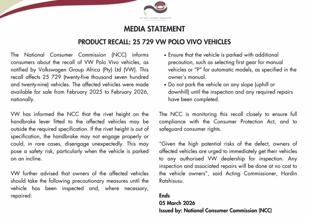 Die Nasionale Verbruikerskommissie het aangekondig dat 25 729 Volkswagen Polo Vivo-voertuie landwyd herroep word, nadat Volkswagen Group Africa ’n moontlike fout met die handrem geïdentifiseer het. Die betrokke voertuie is tussen Februarie 2025 en Februarie 2026 verkoop.