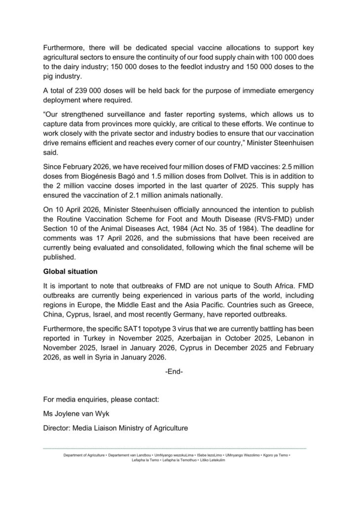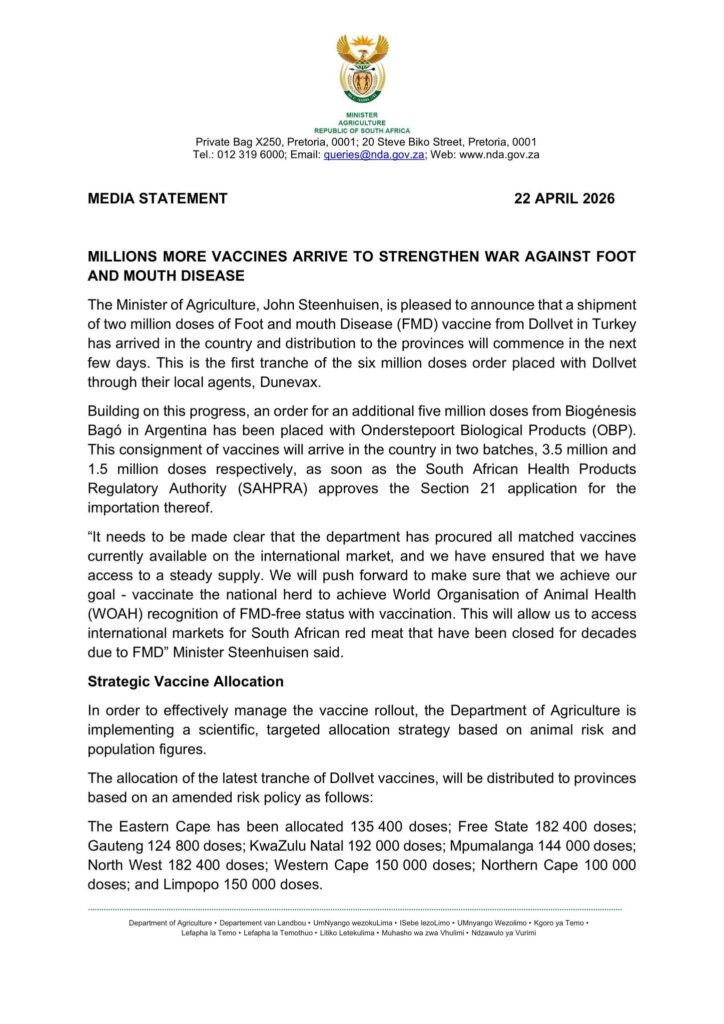 John Steenhuisen, die minister van landbou, het aangekondig dat ’n eerste besending van twee miljoen entstofdosisse teen bek-en-klouseer van Turkye af in Suid-Afrika aangekom het. Die minister sê die doel is om genoeg diere landwyd in te ent om internasionale erkenning as ’n bek-en-klouseer-vrye land te verkry, wat weer uitvoergeleenthede vir rooivleis kan verbeter.