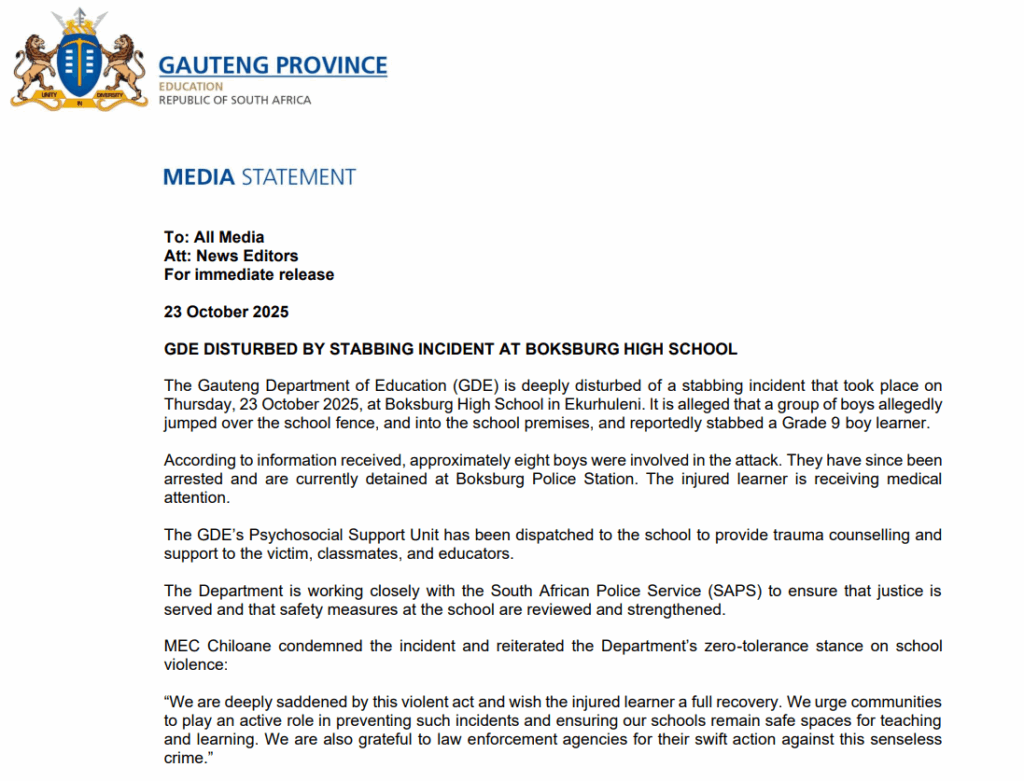 Steve Mabona, GDO-woordvoerder, sê in ‘n verklaring volgens inligting het die groep seuns glo oor die skool se draad gespring en die slagoffer gesteek. Hulle is intussen in hegtenis geneem en word by die Boksburg-polisiekantoor aangehou. Die beseerde leerling ontvang mediese behandeling. Die onderwysdepartment het sy kommer ná die steekvoorval uitgespreek en ‘n psigososiale ondersteuningspan na die skool gestuur om traumaberading en bystand aan die slagoffer, klasmaats en onderwysers te verleen.