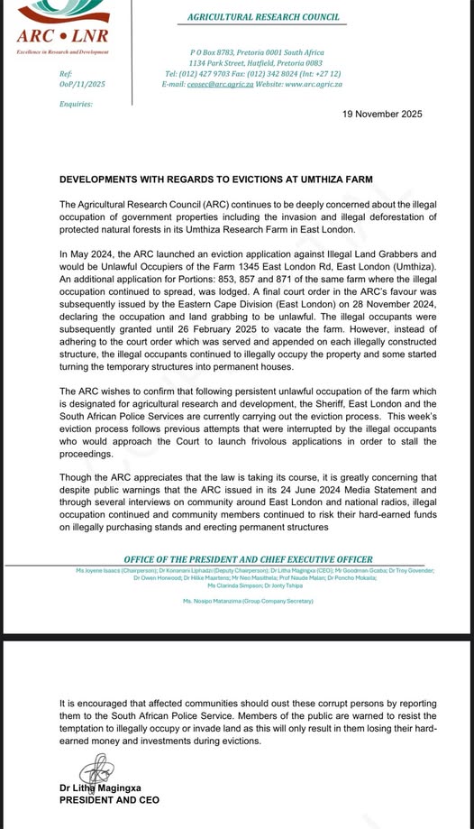 OOS-KAAP. – Die Landbounavorsingsraad (LNR) bevestig dat uitsettings op die Umtiza-navorsingsplaas in Oos-Londen weens volgehoue onwettige grondbesetting voortgaan.