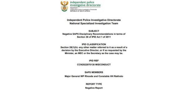 Lizzy Suping, Opod-woordvoerder, sê die ondersoek het slegs gefokus op die optrede van polisiebeamptes, soos deur wetgewing vereis en nie op die kriminele elemente van die saak self nie. Volgens Opod het genl.maj. Wally Rhoode en konst. Hendrick Rekhotso die SAPD-wet oortree deur nie ’n voorgeskrewe misdryf betyds by hul bevelvoerder aan te meld nie. Daar is ook bevind dat hulle nie ’n saak behoorlik geregistreer het nie en dat sekere prosedures nie nagekom is nie. Die ondersoek is reeds in 2023 afgehandel, maar die verslag is eers in 2026 bekend gemaak om nie ander ondersoeke te benadeel nie. Opod sê hy hou voet by stuk dat sy bevindings en aanbevelings korrek is, ondanks die polisie se eie interne ondersoek wat tot ’n ander gevolgtrekking gekom het.