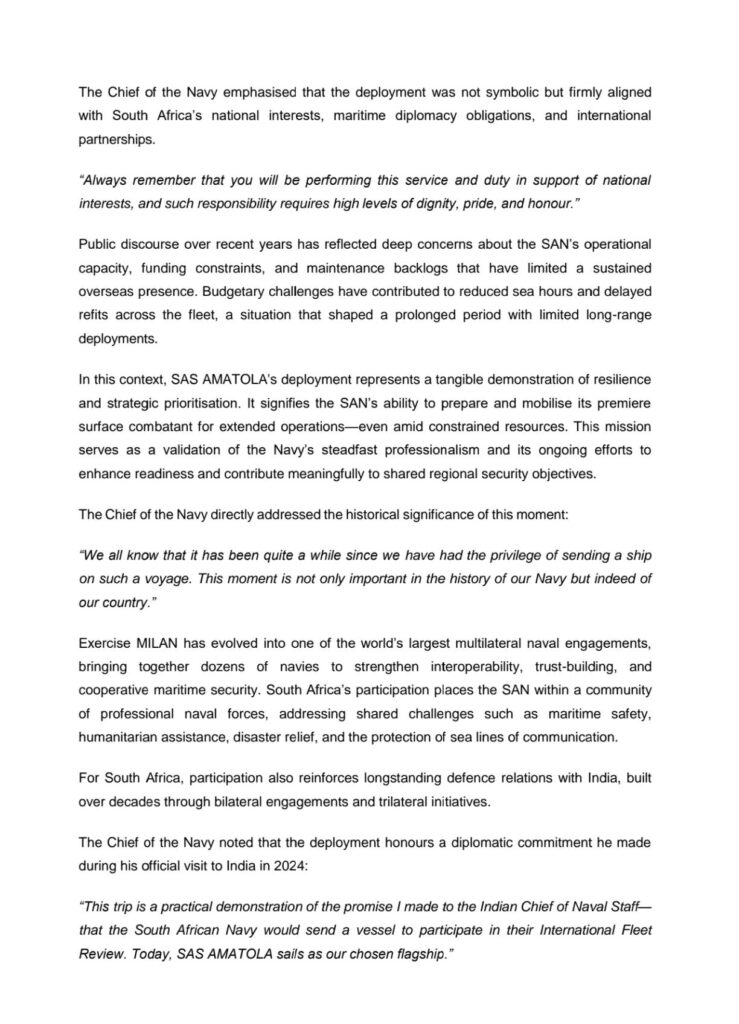 Die Suid-Afrikaanse Vloot het die fregat SAS Amatola na Indië ontplooi om die land by die 2026 Internasionale Vlootevaluering en Oefening MILAN, aangebied deur die Indiese Vloot, te verteenwoordig.