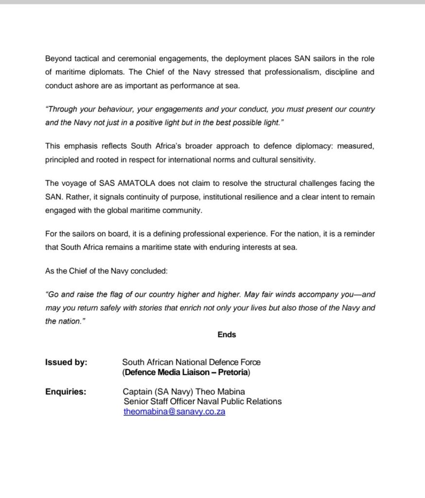 Volgens ‘n verklaring van die departement van verdediging bevestig die ontplooiing Suid-Afrika se rol in multilaterale maritieme samewerking in die Indiese Oseaan-streek en dui dit op ‘n hernieude vermoë om ondanks begrotingsbeperkings langafstandsendings te onderneem.