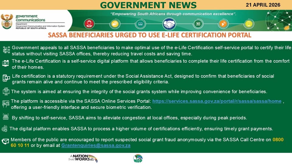 Sassa moedig begunstigdes aan om hul lewensstatus via die-Life Certification-stelsel aanlyn te bevestig, eerder as om kantore te besoek.