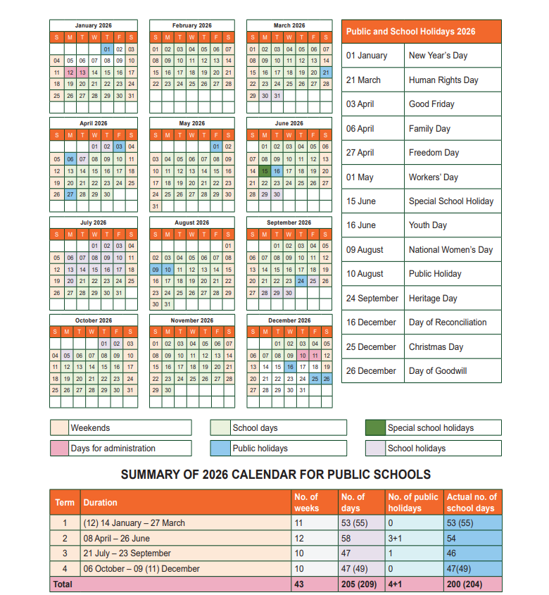 Die departement van onderwys het die amptelike skoolkalender vir 2026 bekend gemaak. Volgens die kalender sal openbare skole in totaal 200 skooldae hê, wat van 14 Januarie tot 9 Desember 2026 sal strek.