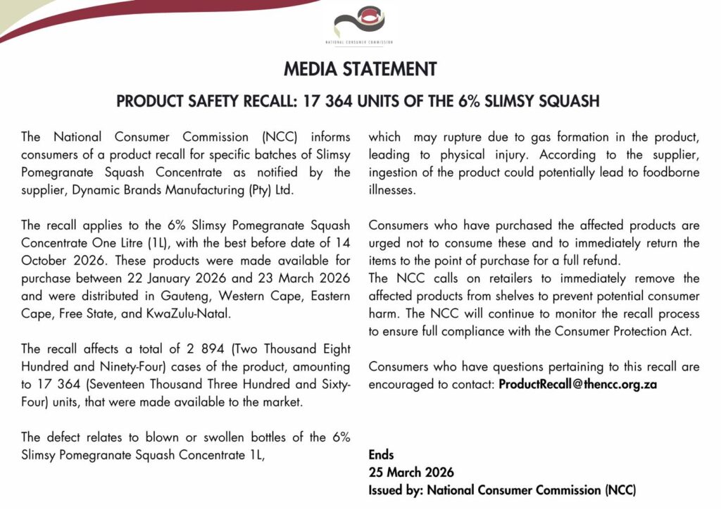 Die NVK sê die terugroeping behels sekere bottels van 6% Slimsy Pomegranate Squash Concentrate (1liter) met ’n beste-voor-datum van 14 Oktober 2026. Hierdie bottels kan gas in die produk ontwikkel, wat kan lei tot voedselvergiftiging indien dit ingeneem word. Die NVK versoek verbruikers wat hierdie produk in hul besit het om dit nie te gebruik nie en dit terug te neem na die punt van aankoop vir ’n volledige terugbetaling.