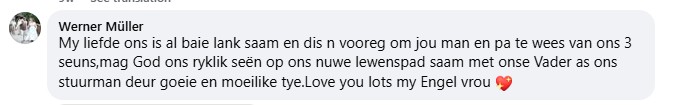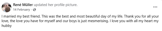 René het ‘n plasing oor hulle huwelik op 14 Februarie op sosiale media gedeel, waarna Werner kommentaar gelewer het.