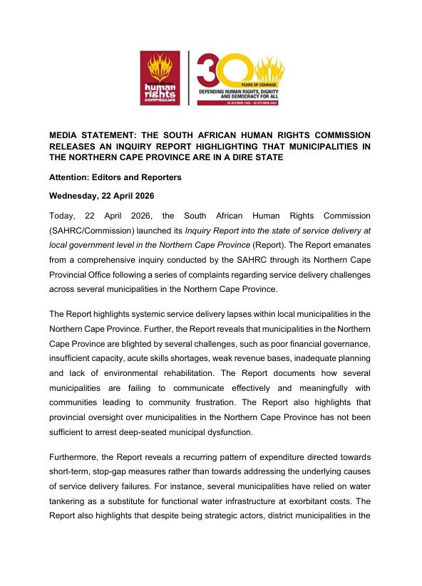 NOORD-KAAP. – Die Suid-Afrikaanse menseregtekommissie (SAMRK) het ’n ondersoekverslag bekend gemaak wat wys dat dienslewering in verskeie munisipaliteite in die Noord-Kaap in ’n kommerwekkende toestand is. Die kommissie sê die verslag volg op talle klagtes van inwoners oor swak dienslewering en is saamgestel ná ’n deeglike ondersoek deur sy provinsiale kantoor.