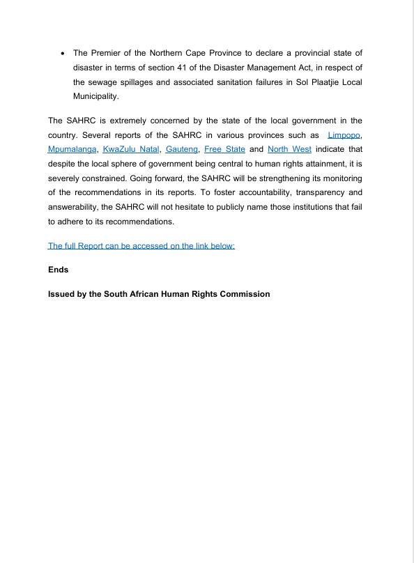 Spesifieke optrede word onder meer aanbeveel in die Kai !Garib- plaaslike munisipaliteit, waar bewerings van bedrog ondersoek moet word, asook in die Sol Plaatjie- plaaslike munisipaliteit, waar ’n moontlike rampverklaring oor rioolprobleme oorweeg word.