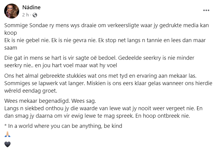 Nádine sê in haar inskrywing: “Die gat in mens se hart is vir sagte oë bedoel. Gedeelde seerkry is nie minder seerkry nie … en jou hart voel maar wat hy voel.”