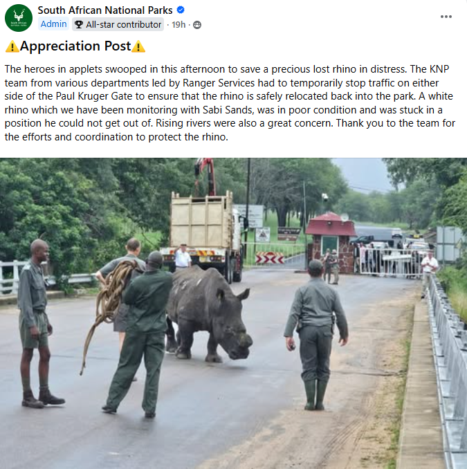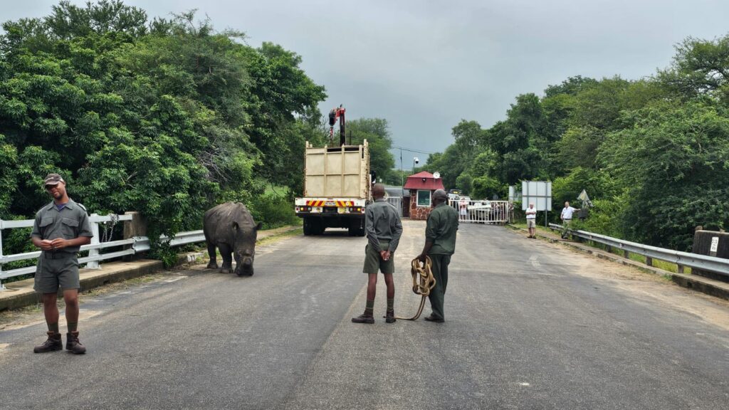 MPUMALANGA. – ’n Witrenoster wat in nood verkeer het, is Maandagmiddag veilig na die Krugerwildtuin teruggeneem nadat ’n span van verskeie afdelings van die park betyds ingegryp het. Verkeer is tydelik aan albei kante van die Paul Kruger-hek tot stilstand gebring om die dier se veiligheid te verseker.